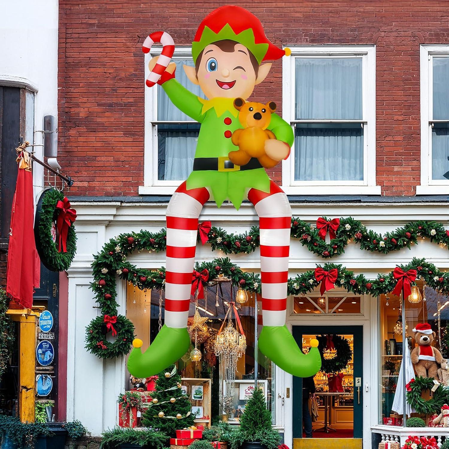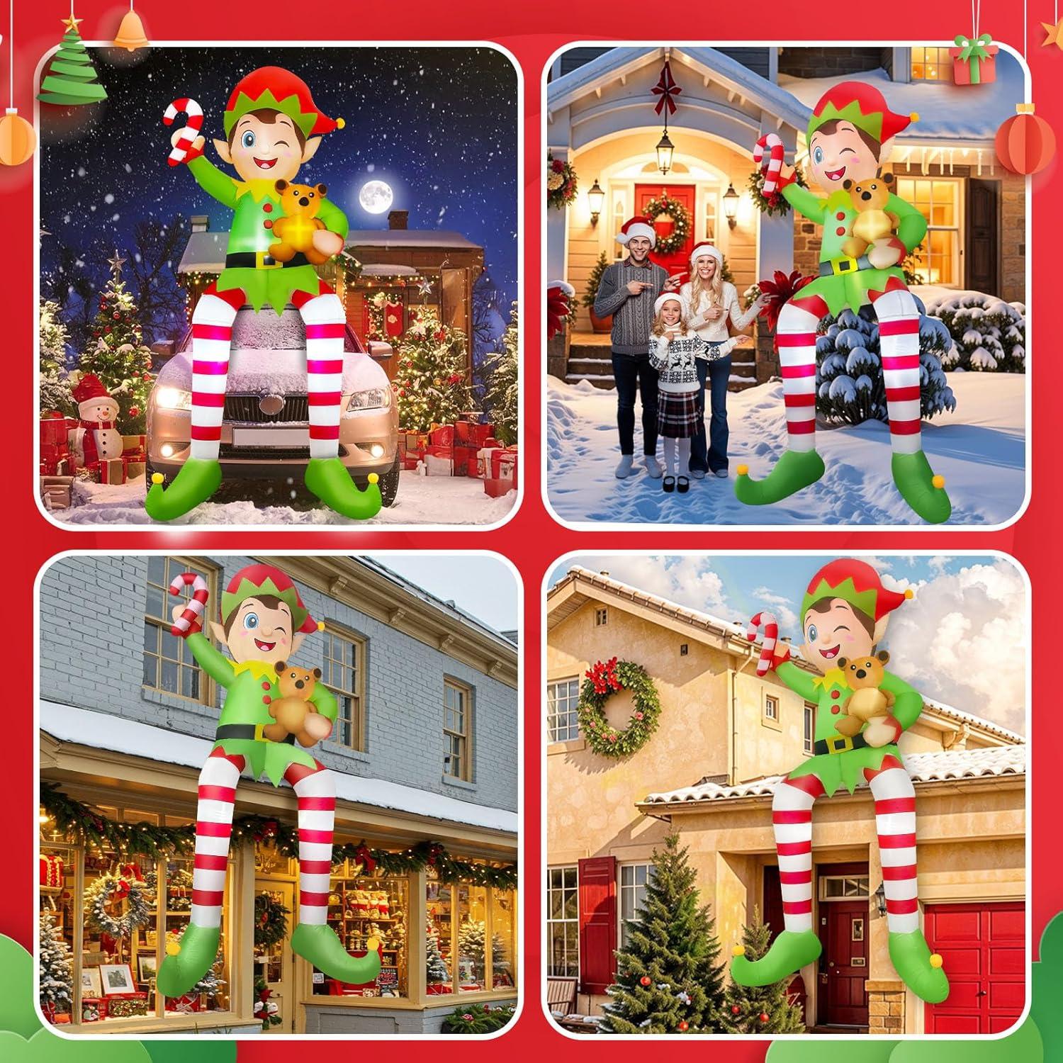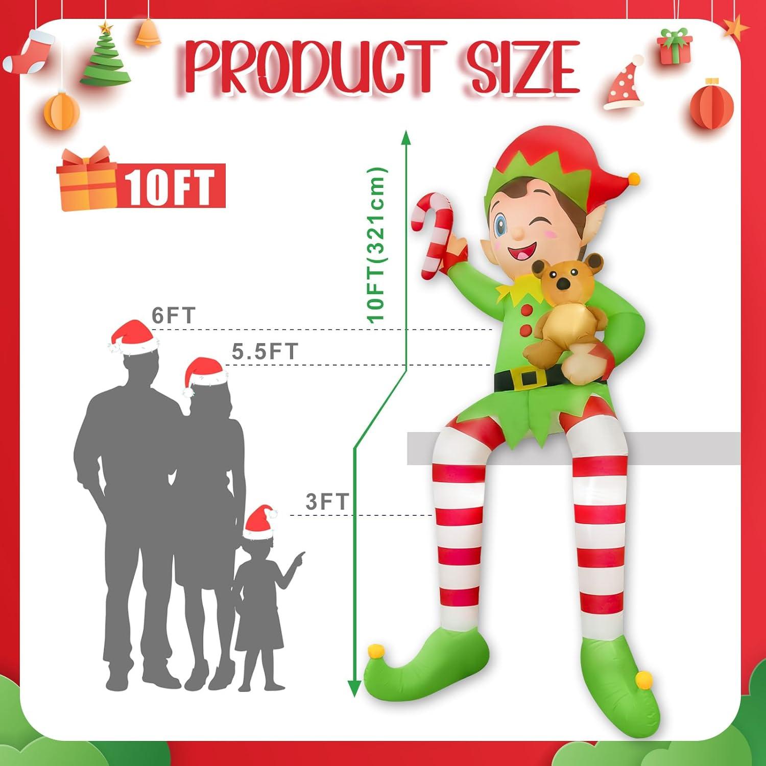 【Adorable Design】: This 10-foot giant Christmas inflatables elf features a charming sitting posture, holding a teddy bear in one hand and a candy cane in the other, with a winking smile that instantly adds holiday cheer. The bright green outfit, red hat, and striped leggings bring classic Christmas colors to your yard. Perfect for creating a lively and welcoming holiday atmosphere for families, neighbors, and guests.