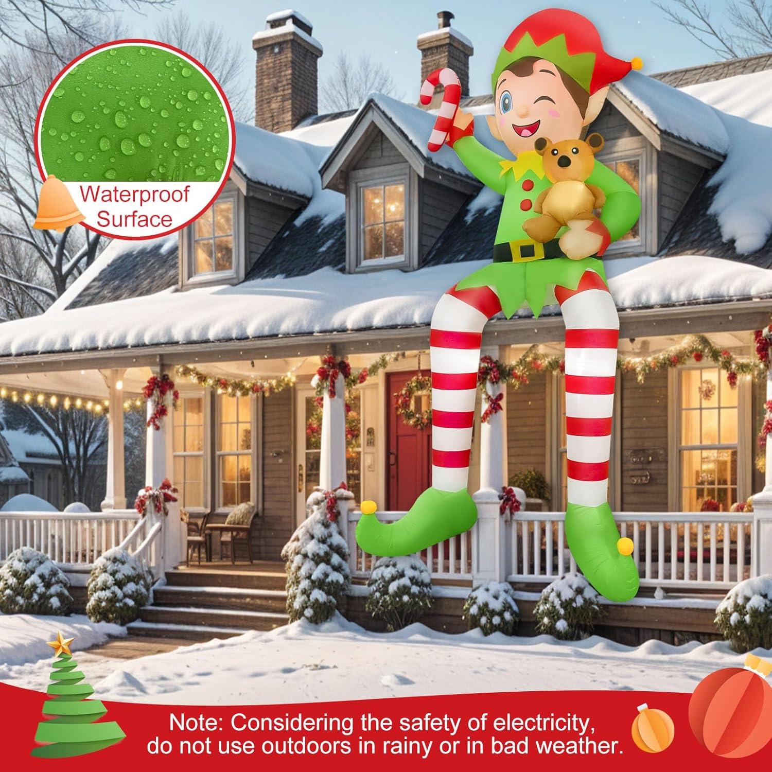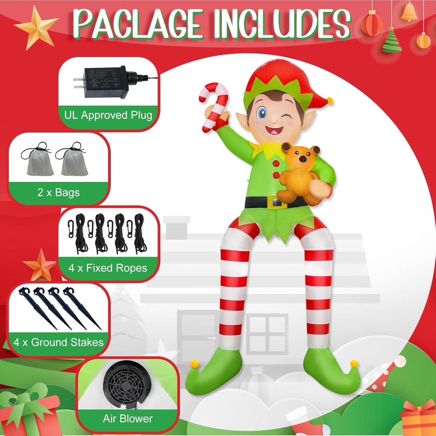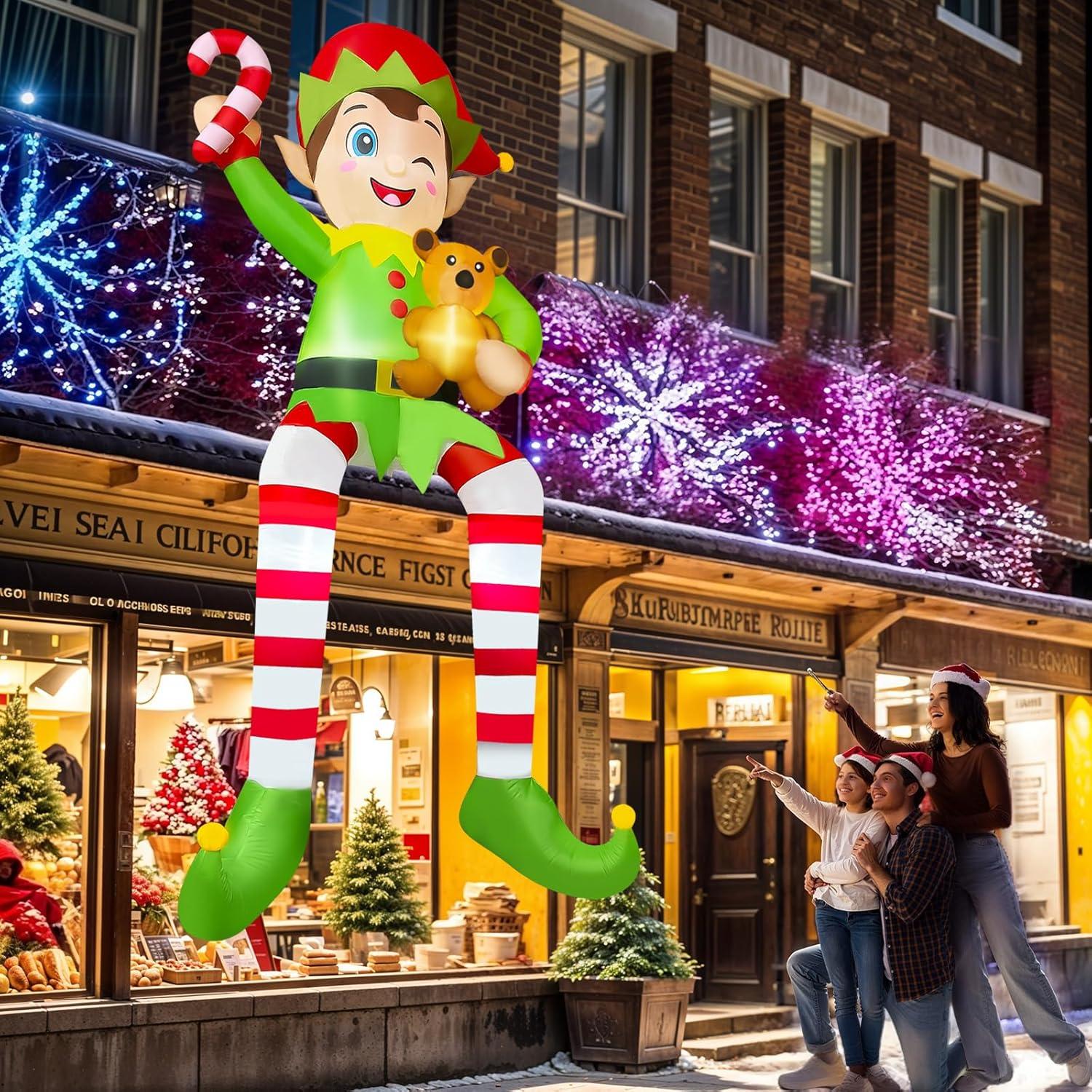 【Adorable Design】: This 10-foot giant Christmas inflatables elf features a charming sitting posture, holding a teddy bear in one hand and a candy cane in the other, with a winking smile that instantly adds holiday cheer. The bright green outfit, red hat, and striped leggings bring classic Christmas colors to your yard. Perfect for creating a lively and welcoming holiday atmosphere for families, neighbors, and guests.