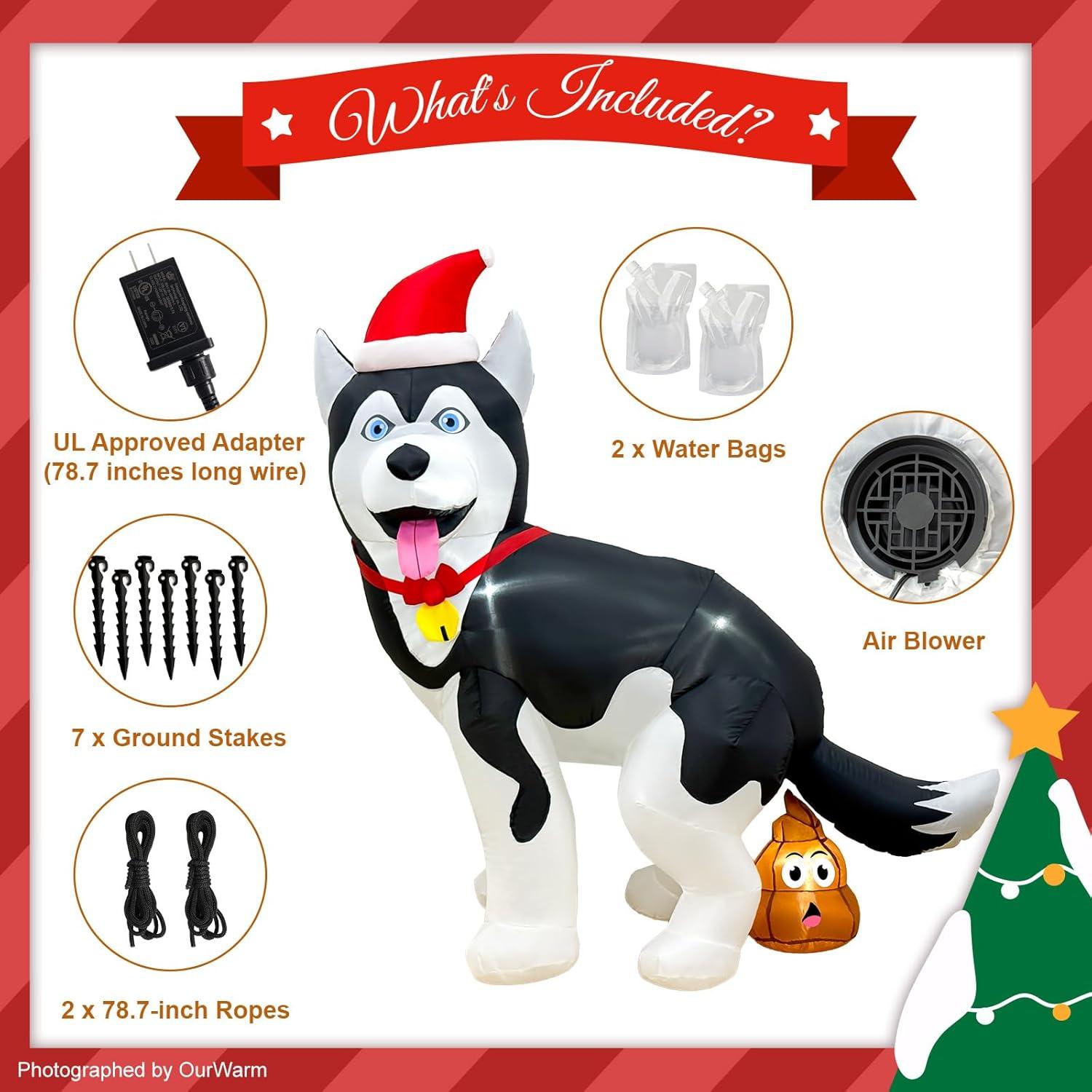 Stable and Secure Outdoor Christmas Decor: To keep your Christmas inflatables outdoor steady and secure, this Christmas blow ups for outside comes with seven ground stakes, 2 water bags, and 2 x 78.7-inch fastened ropes. These accessories ensure that your Husky dog Christmas inflatable stays in place, even during windy weather, so you can enjoy your humorous Christmas display worry-free