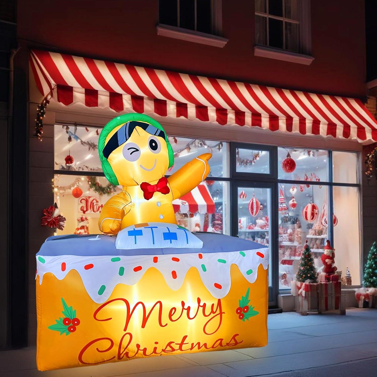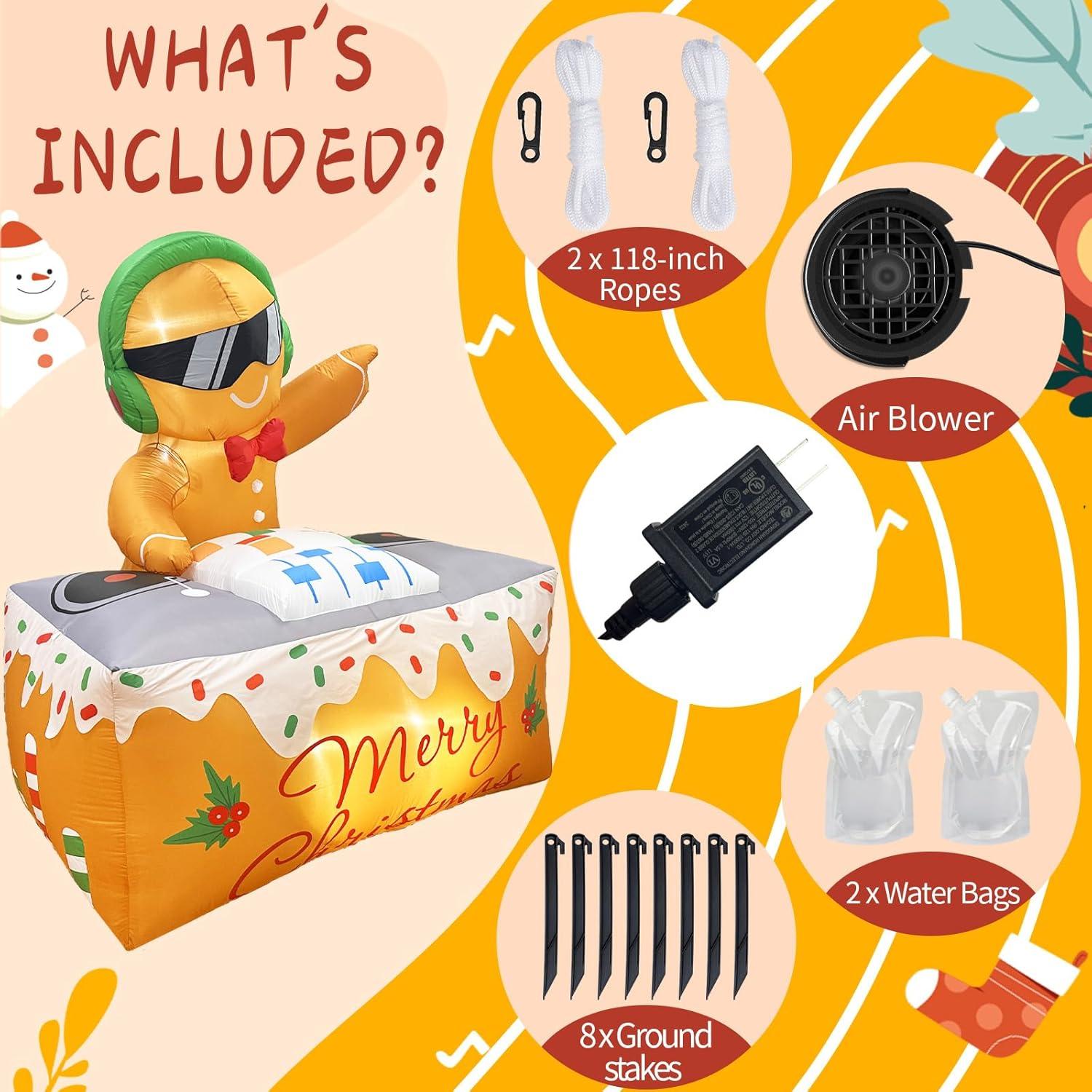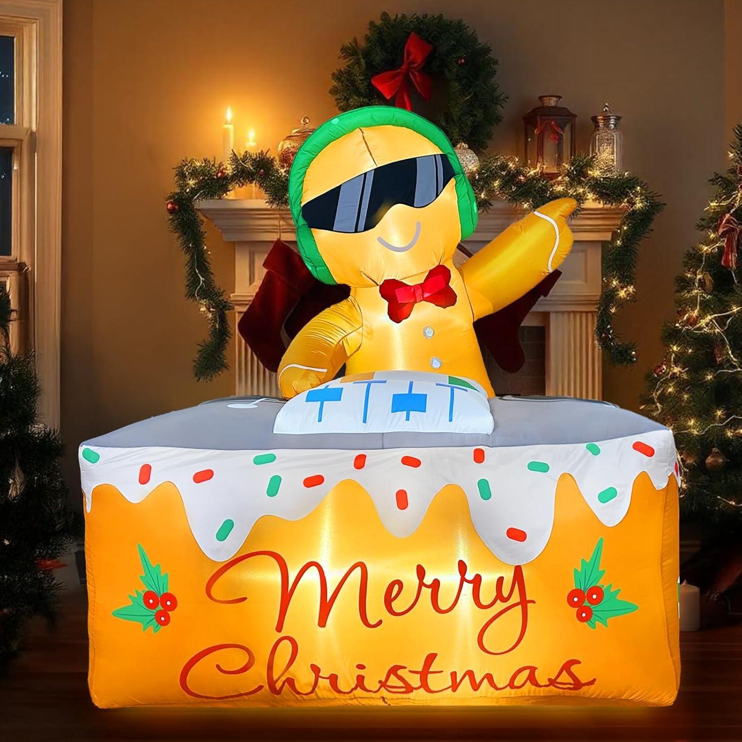 Gingerbread Decor: The inflatable Christmas decorations outdoor are 6FT in height, and 5.5 FT wide. This gingerbread inflatable features a fun and cool gingerbread man wearing headphones and adjustable sunglasses, standing behind a DJ booth, and waving his hand. Playful and modern elements that stand out from traditional decor.