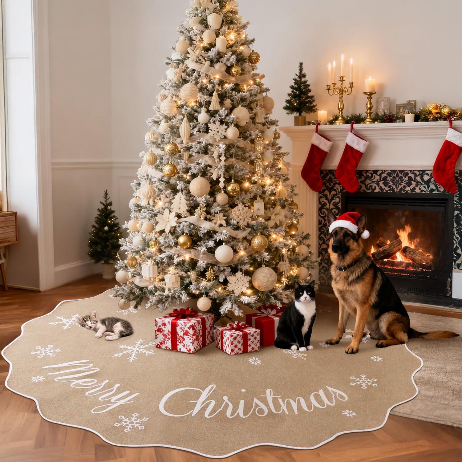 Pet-Friendly & Protective – The sturdy design withstands pets’ playful antics while shielding floors and carpets from pine needles, sap, and debris. This extra large tree skirt keeps your home festive and clean throughout the Christmas season for homes seeking both style and practicality