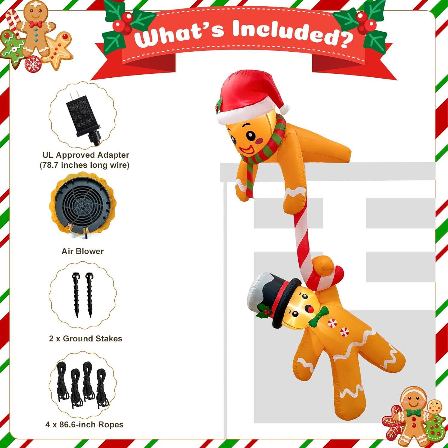 Funny Gingerbread Design: Make your yard the talk of the neighborhood with our Christmas outdoor inflatables featuring two adorable gingerbread men. One wears a Santa hat while cheerfully pulling up his frightened friend using a giant candy cane. Their playful climbing pose adds humor and festive cheer to any holiday display