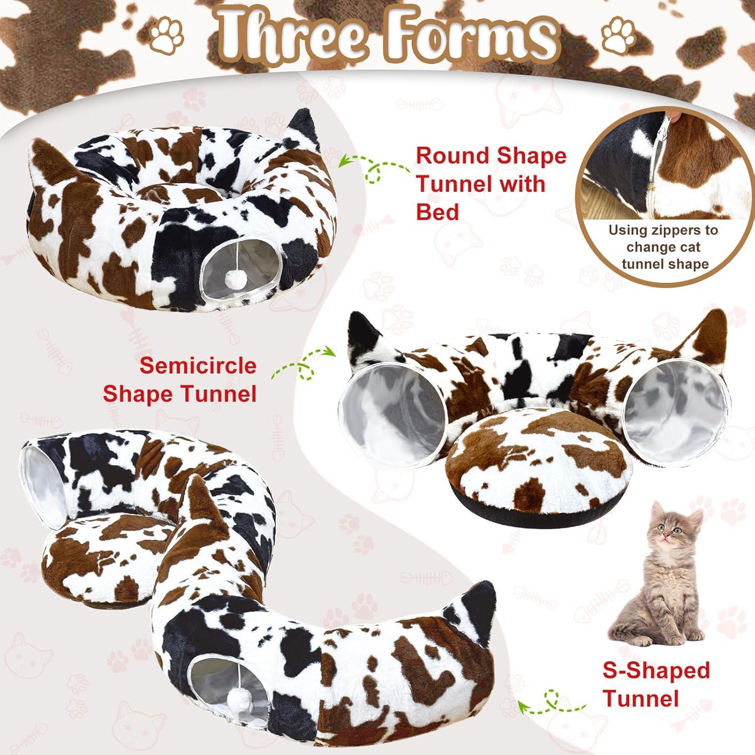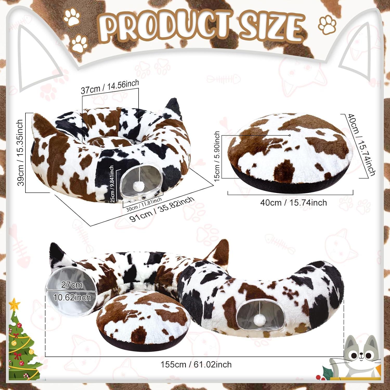 Soft Plush Fabric with Retro Cow Print: Crafted from soft, cat-friendly plush, this cat tunnel features a charming retro farm design in earthy tones of brown, cream, and tan. Whether used as a playful hideaway or a cozy resting spot, this cat bed tunnel offers great comfort and a sense of security. The unique pattern adds a rustic, farm-inspired accent to your home décor, making it a perfect blend of style and functionality