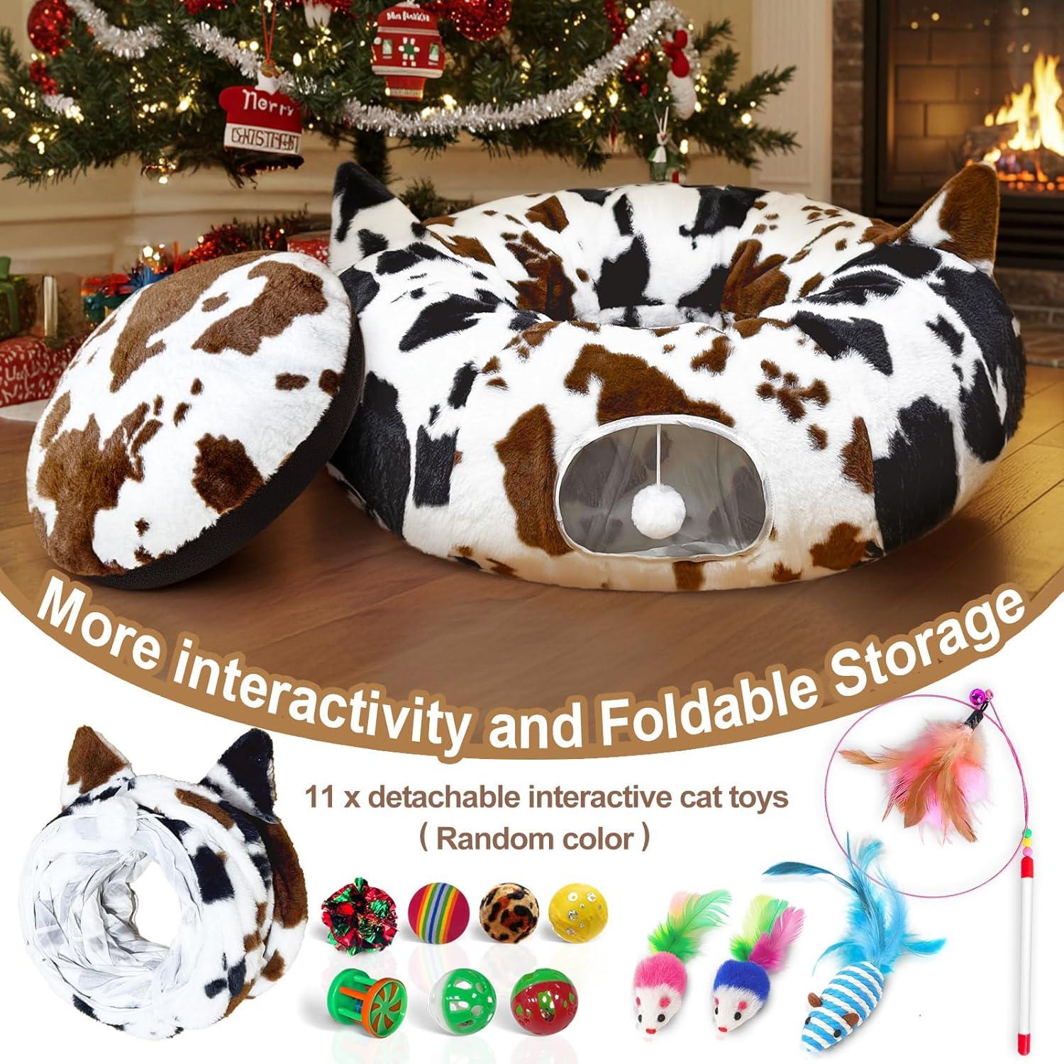Engaging Interactive Elements: Our Christmas cat bed tunnel comes with a hanging ball, creating an enticing entrance for your cat. The two adorable cat ears are carefully designed to make a sound when squeezed, sparking curiosity and stimulating your pet's senses during playtime. Additionally, our cat circle tunnel includes 11 detachable cat toys, offering even more fun and interactive features for you and your cat to enjoy together