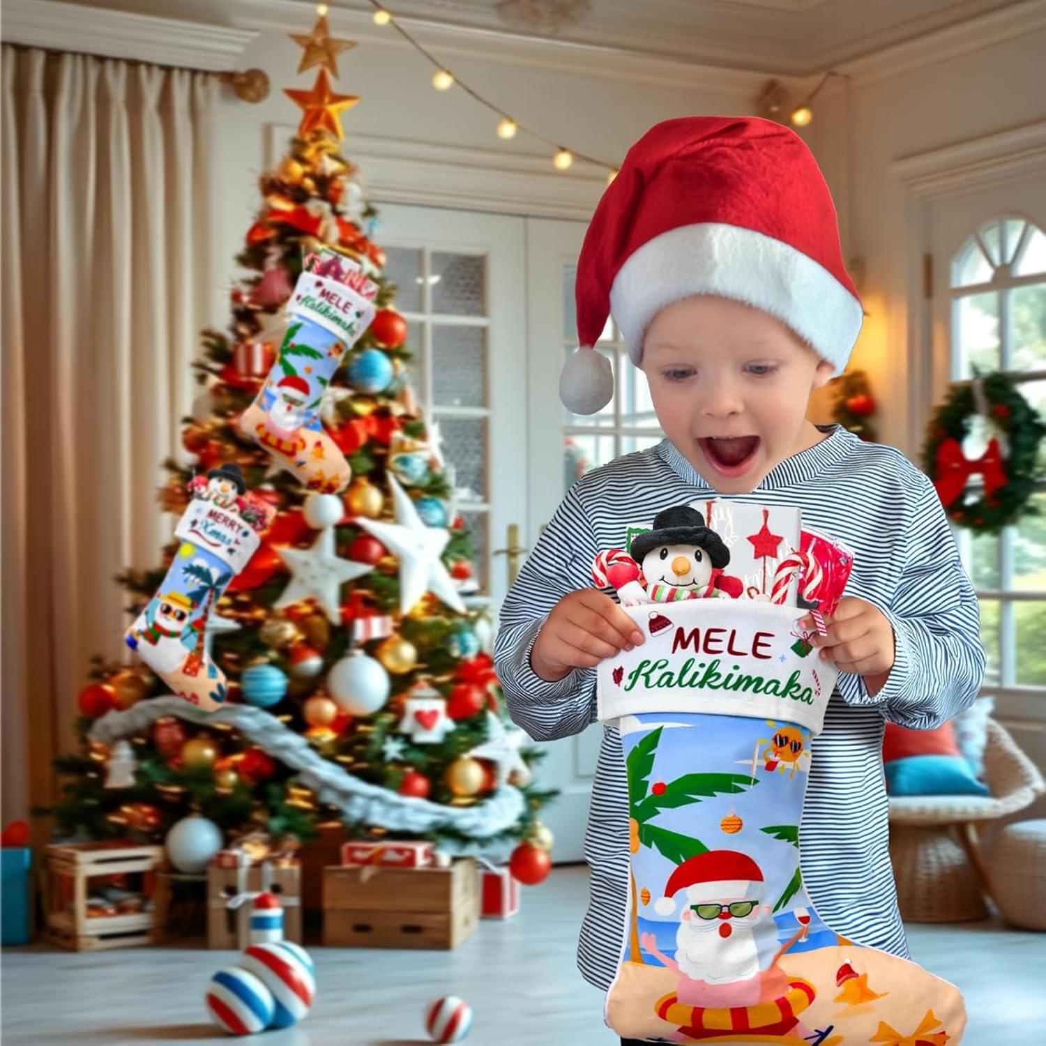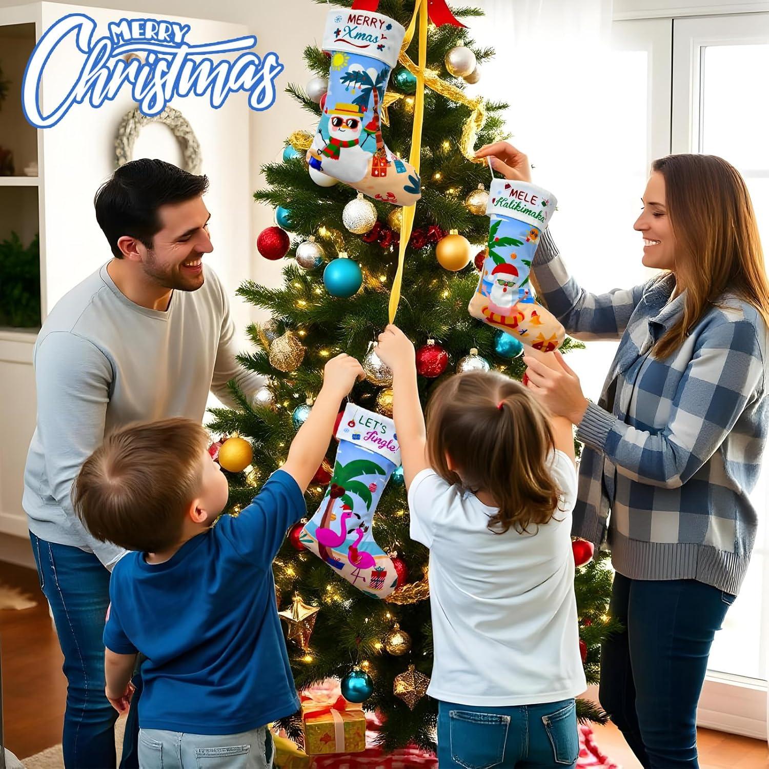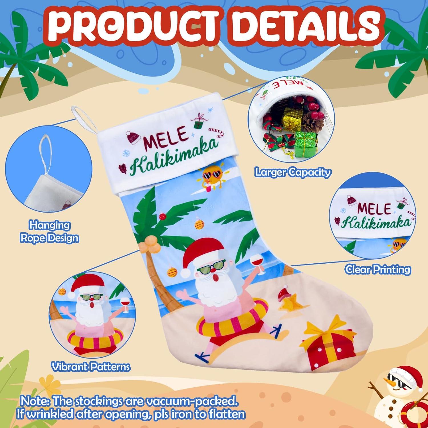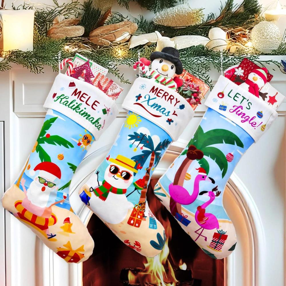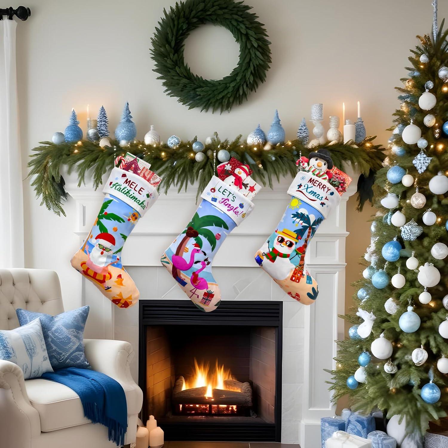 Unique Design: Get ready to bring joy and excitement to your holiday season with our charming Christmas Stockings 3 Pack. Boasting delightful blue stockings Christmas adorned with the most Hawaii Santa Claus, Snowman and Gingerbread Man Cute Patterns, these beach Christmas stockings are the ultimate addition to your Christmas decorations!