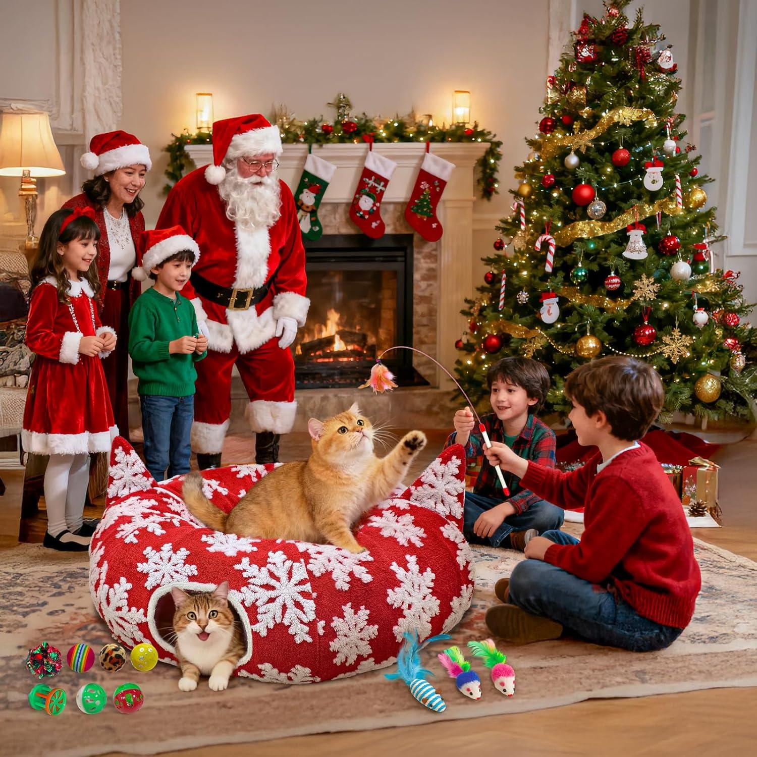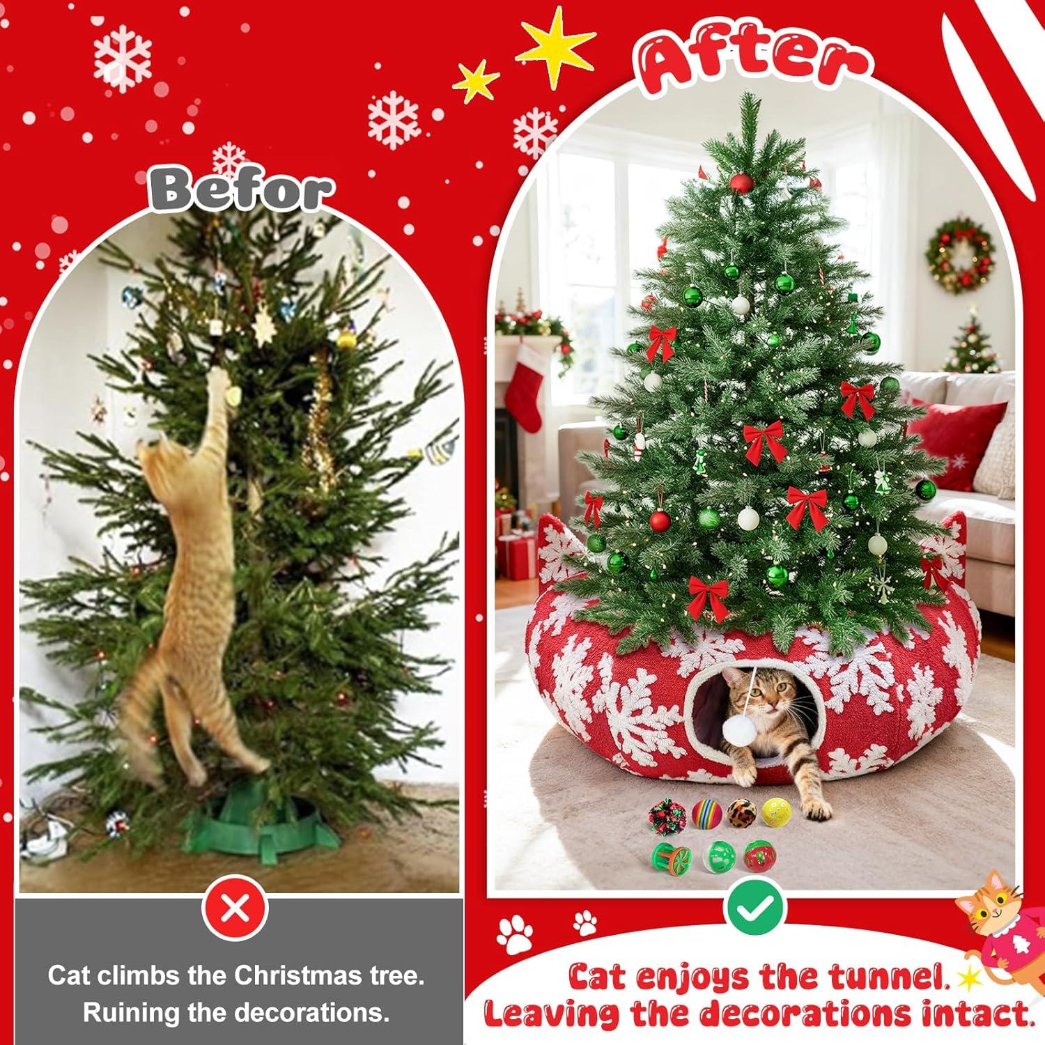 Red Cat Tunnel Under Xmas Tree: The circular layout includes 2 peekaboo openings, turning playtime into an exciting hide-and-seek adventure. Designed with a holiday cat play tunnel look, it doubles as a cheerful decoration, creating a playful yet functional centerpiece under your Christmas tree while keeping pets engaged all year round