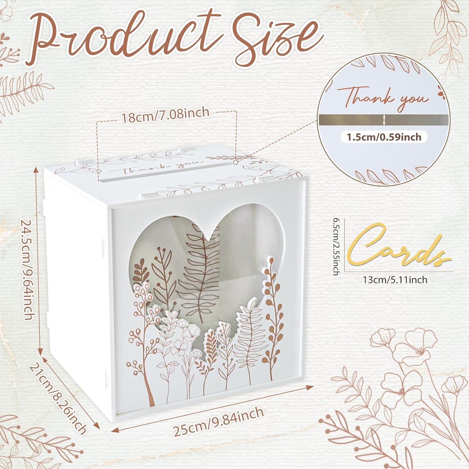 Elegant Wedding Card Box: This beautifully crafted wedding card boxes for reception features a clear acrylic heart-shaped front and white PVC panels adorned with floral and leaf prints, adding vintage charm to any occasion. Perfect as a reception gift box for weddings, baby showers, graduations, or birthdays, it enhances your wedding décor with both elegance and function.