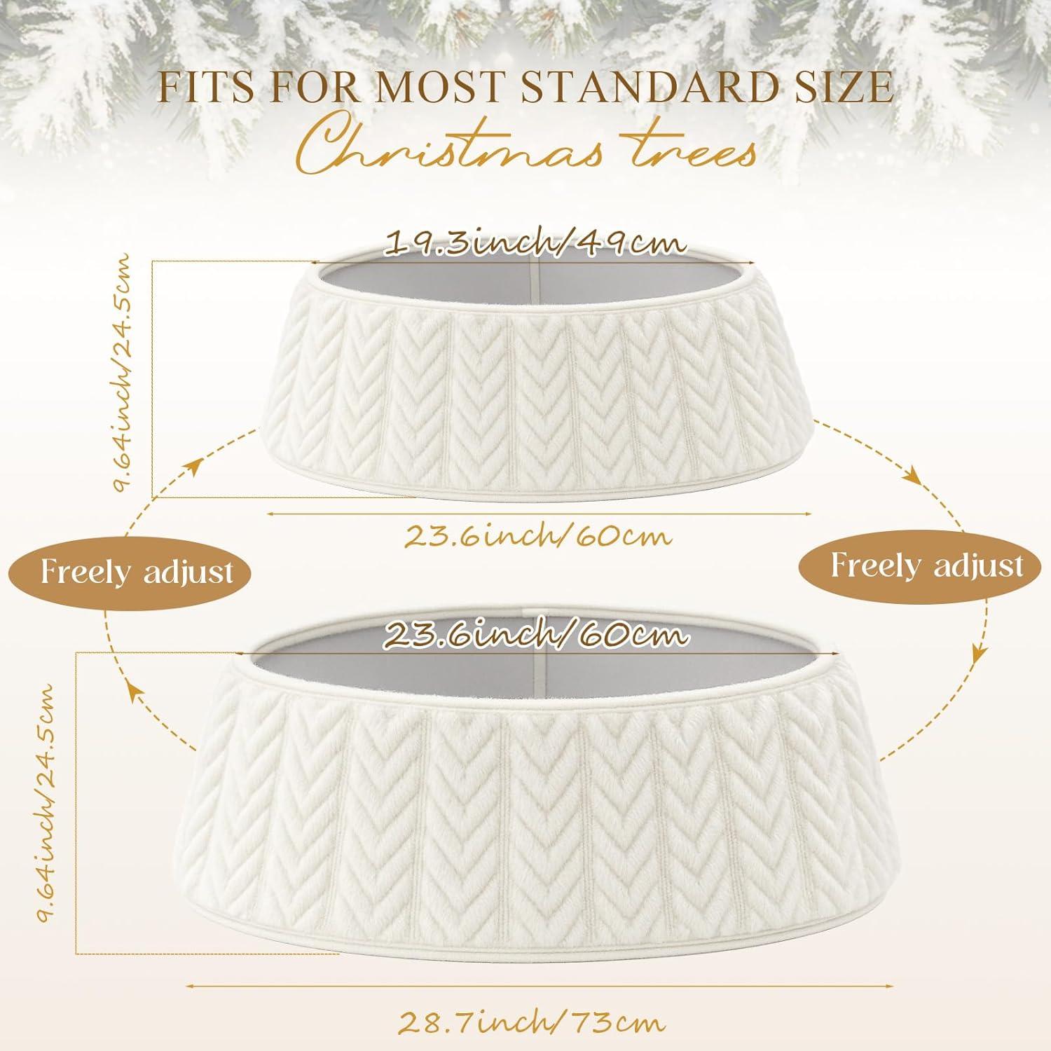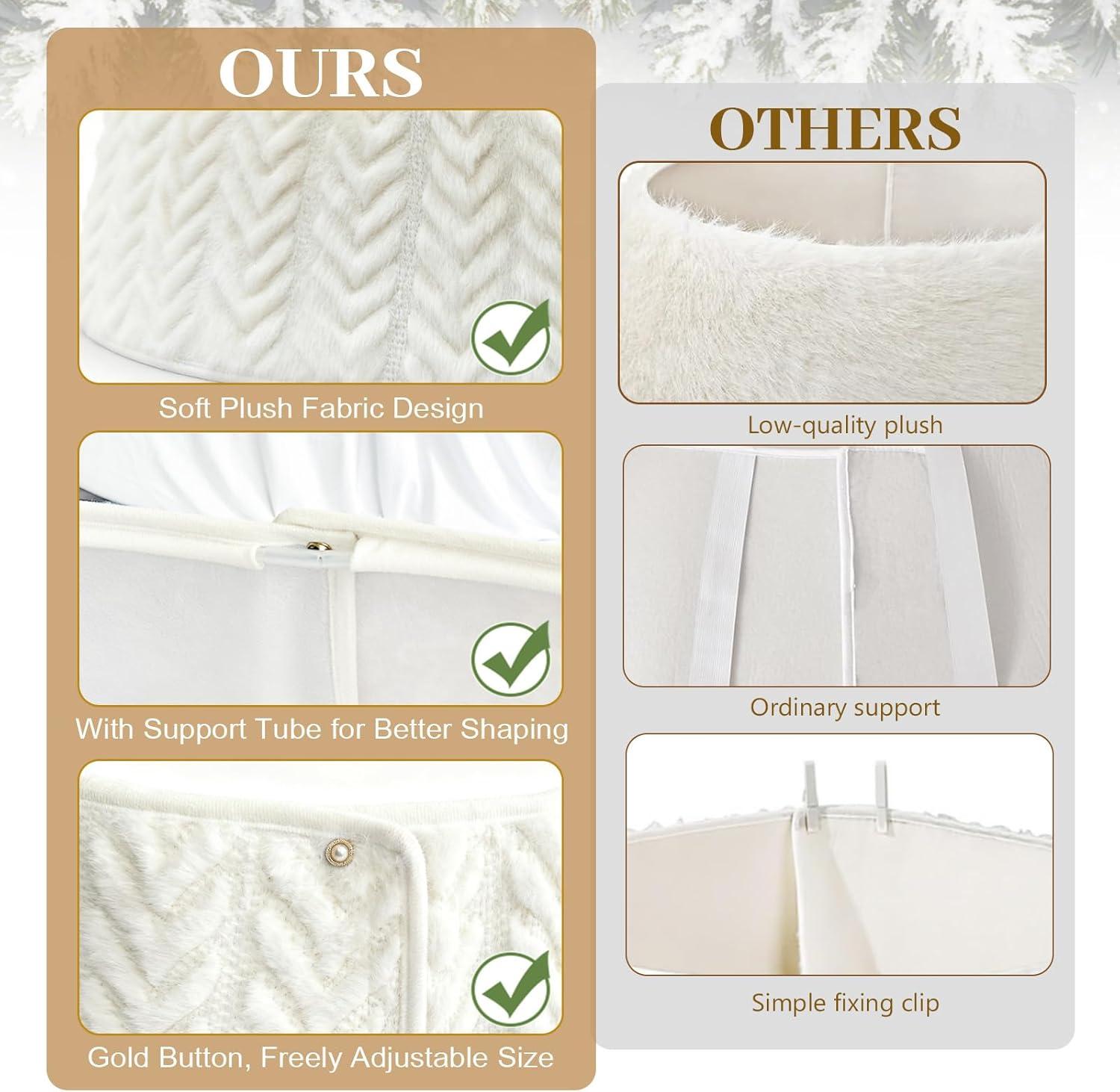 EXTENSIVE APPLICATIONS: Adjustable from 22 to 28 inches wide, this fluffy Christmas tree skirt fits most artificial trees from 4' to 6'. Ideal for home, office, or holiday events, it protects floors from scratches and pine needles while enhancing your festive décor. Complete your rustic farmhouse, modern boho, or traditional Christmas setup effortlessly